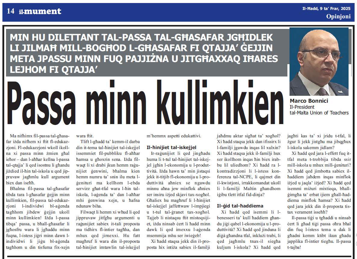 Passa minn kullimkien – Marco Bonnici 09/02/202509/02/2025 by bonnmar Ara l-artiklu li deher fil-gazzetta il-Mument hawn Share this: Click to share on X (Opens in new window) X Click to share on Facebook (Opens in new window) Facebook Like Loading... Related